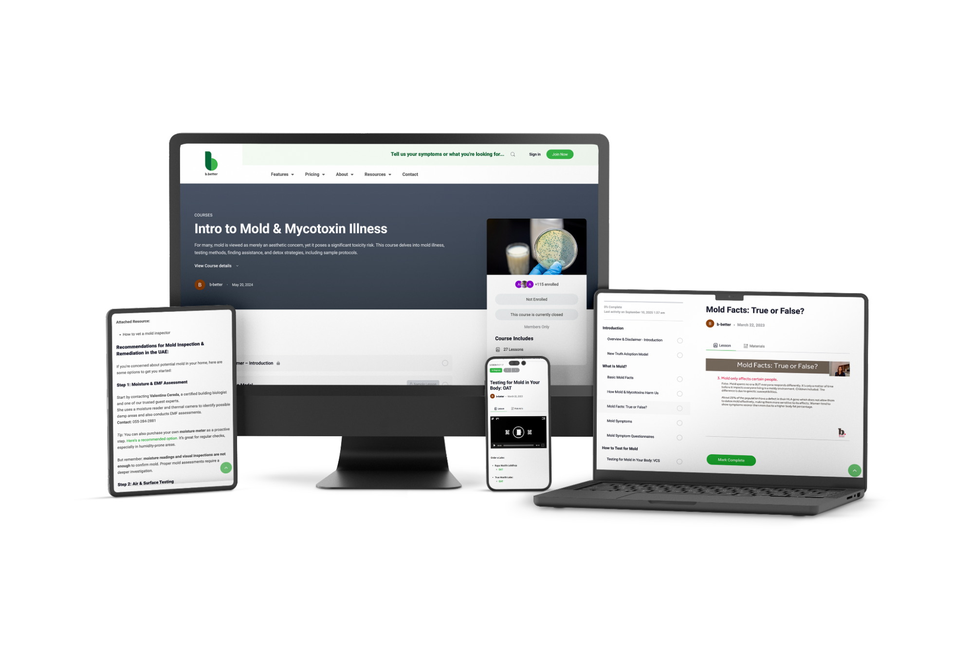 Whether you’re unsure it’s mold or you already suspect it, this course gives you a calm, step-by-step roadmap to lower exposure, test smart (you + your space), and support your body in the right order—so you make progress without flare-ups from jumping into heavy detox too soon.
