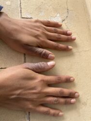 Asking for a friend who is suffering from darkened thumbs that the skin is now breaking. This darkness and dryness is slowley spreading to the knuckles. Moisturizers are not helping with the healing. What tests can she do to determine what’s happening? And what information you would require to start understanding the case better?